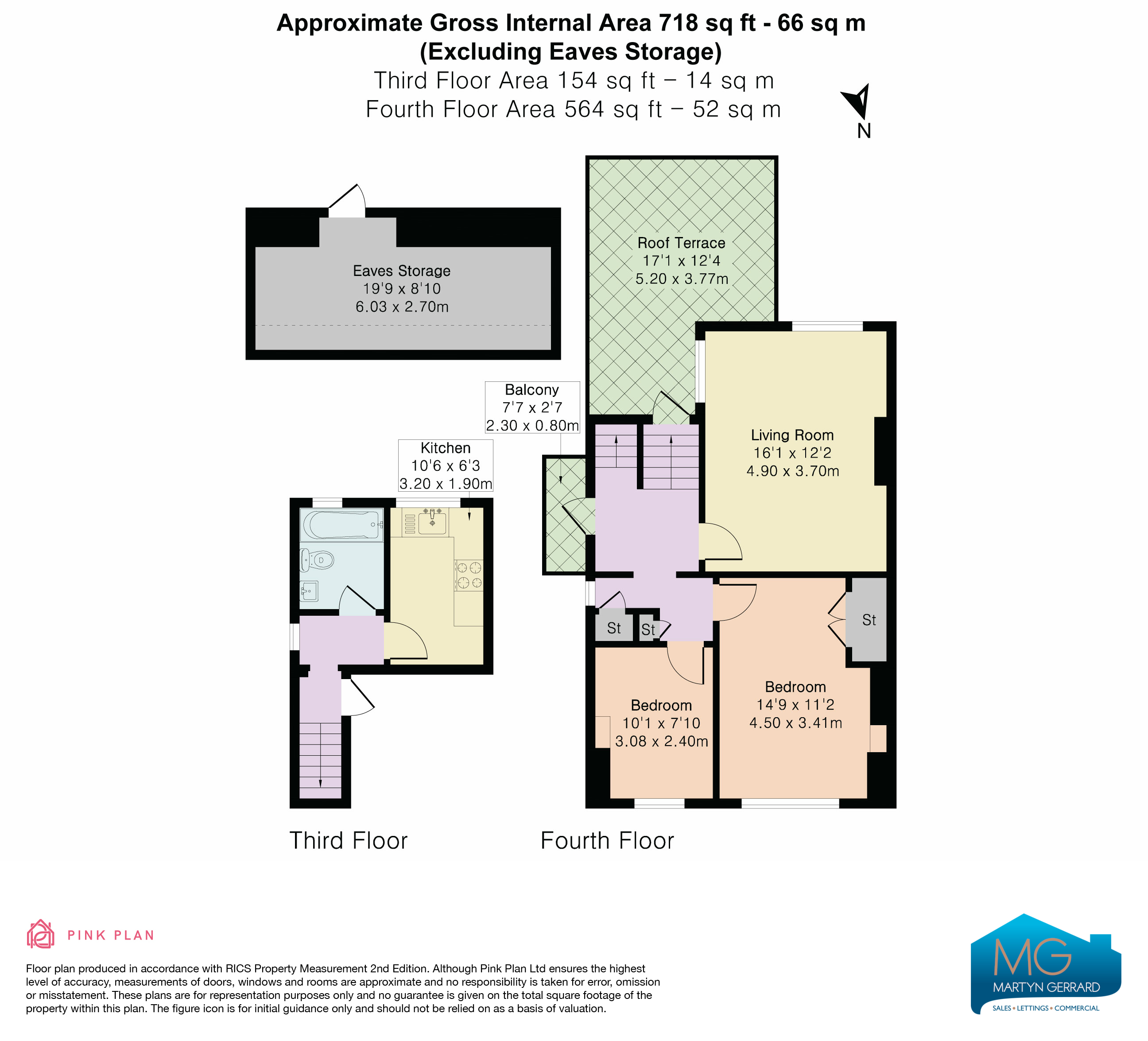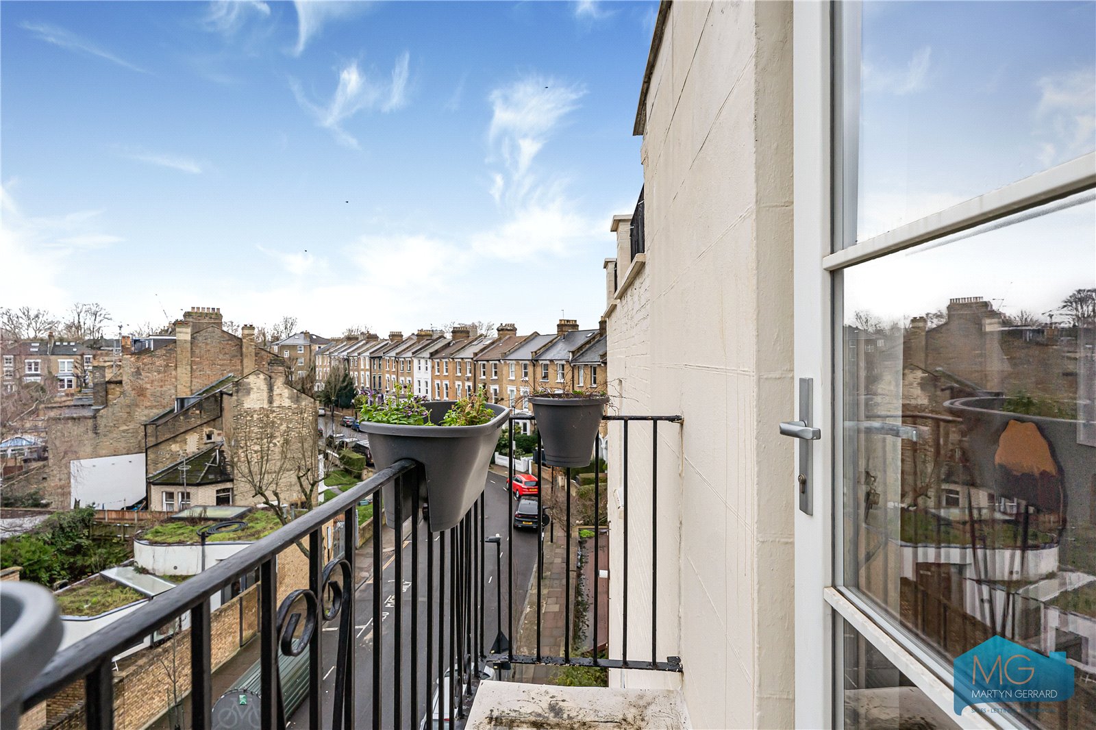 The property features a separate kitchen and living area, two bedrooms, and a bathroom. A standout feature is the private southerly-facing roof terrace, offering far-reaching views across London and ideal for entertaining.