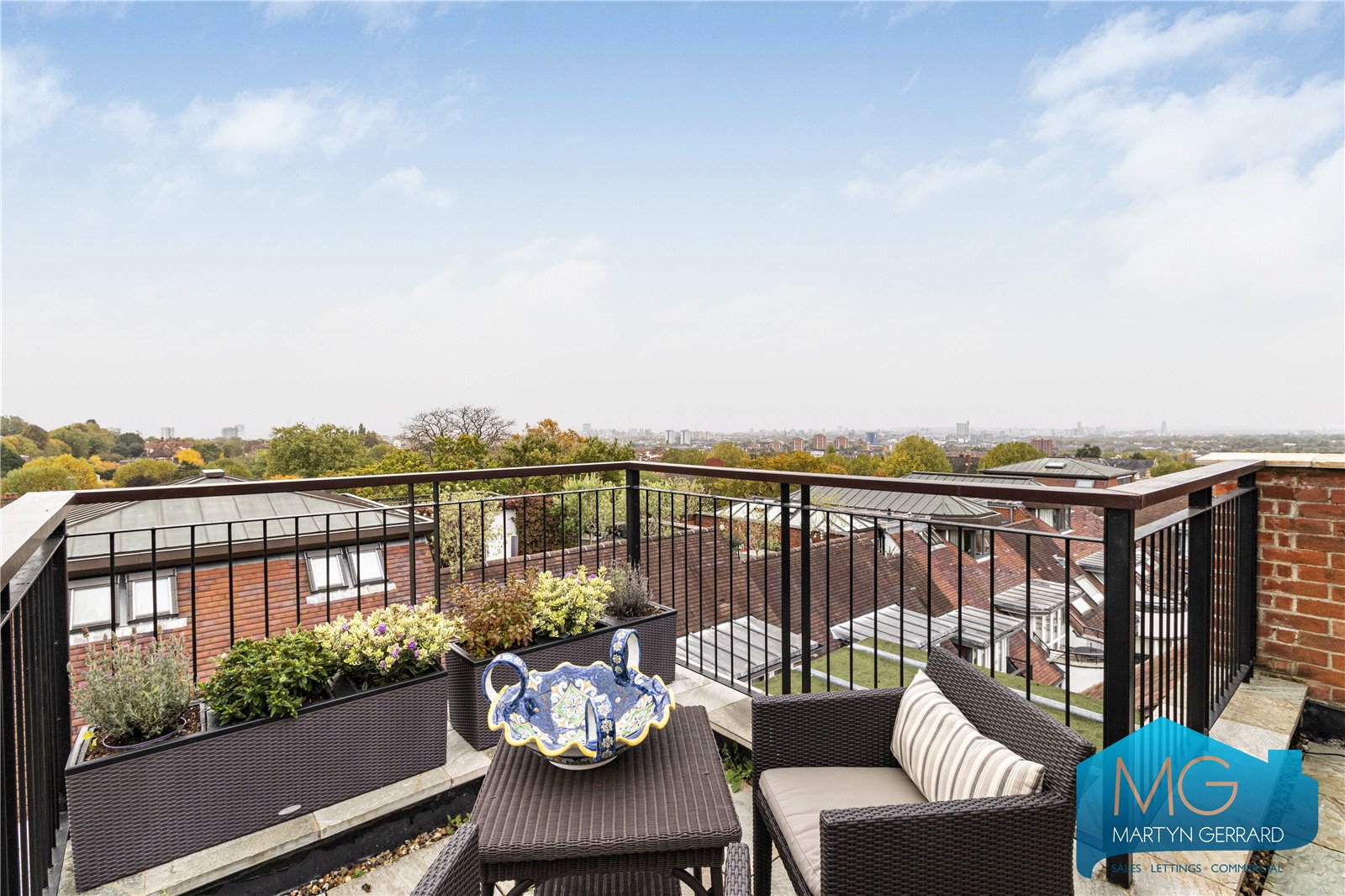 • Southerly private roof terrace with views across East to West London