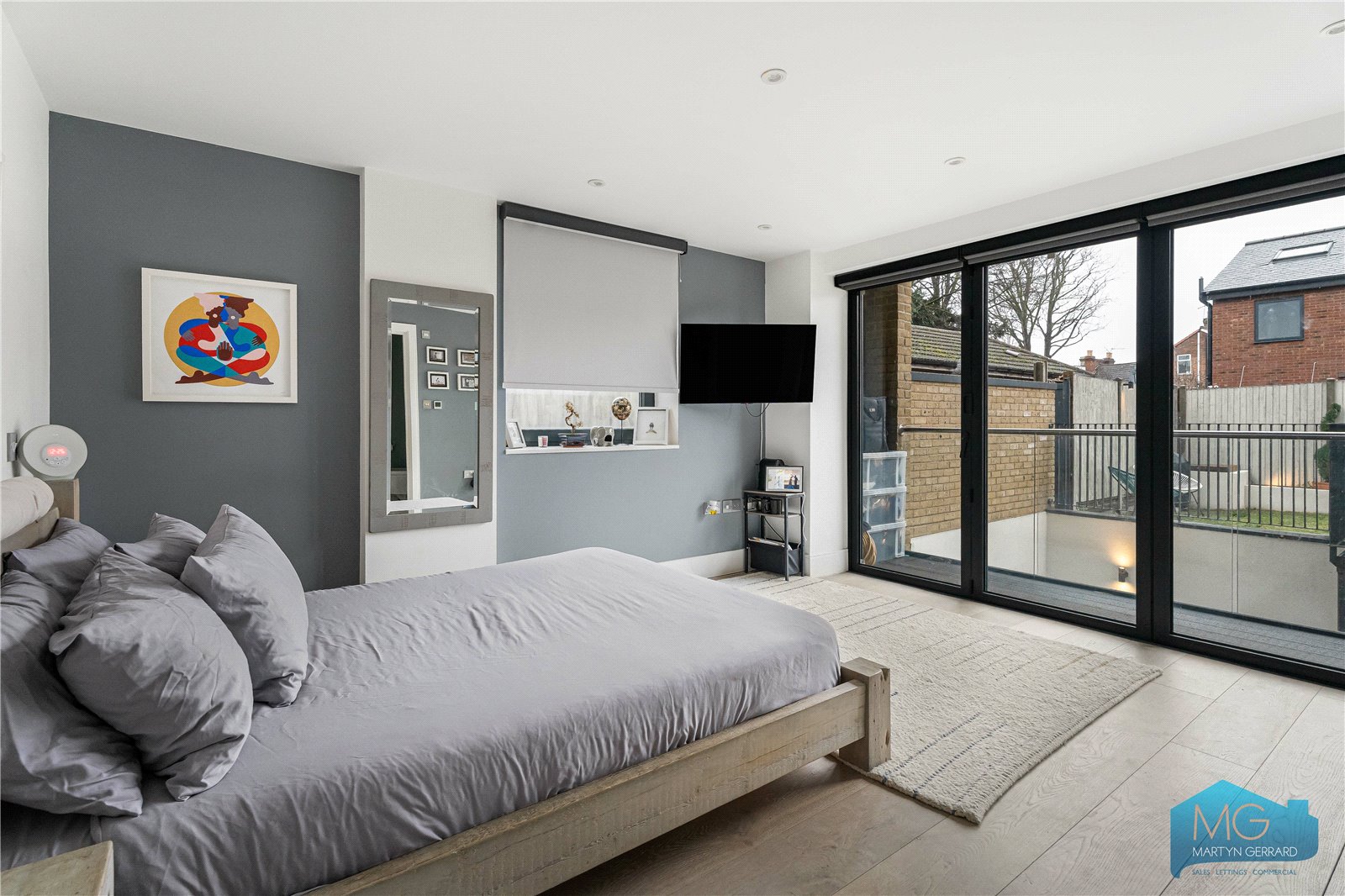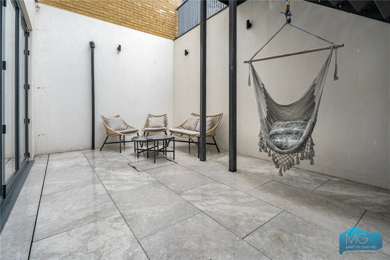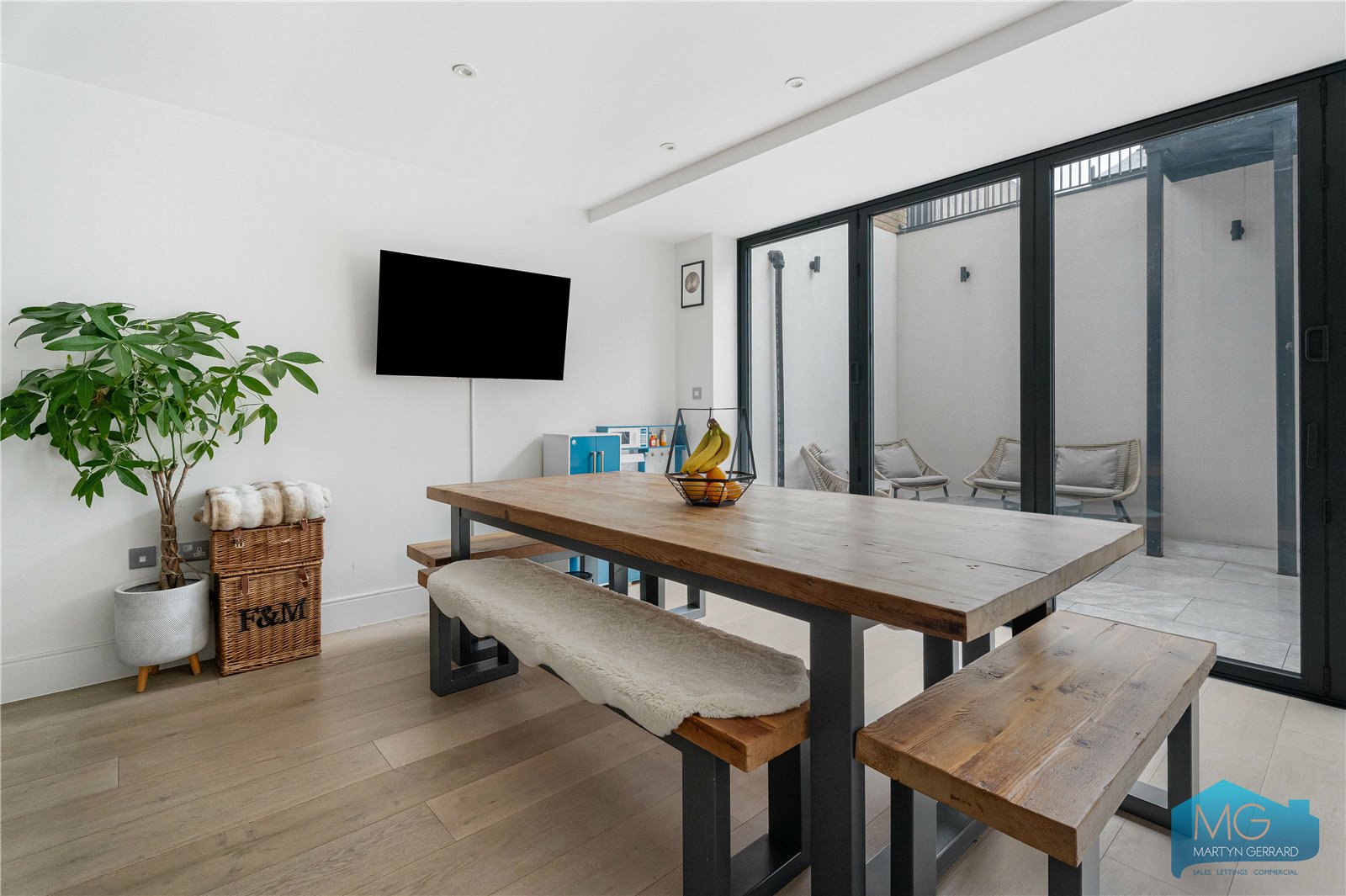 The property offers a spacious open-plan reception and kitchen with direct access to a private courtyard. The principal bedroom benefits from a dressing room, en-suite shower room and access to a private balcony, while two further well-proportioned bedrooms are served by a contemporary family bathroom.
